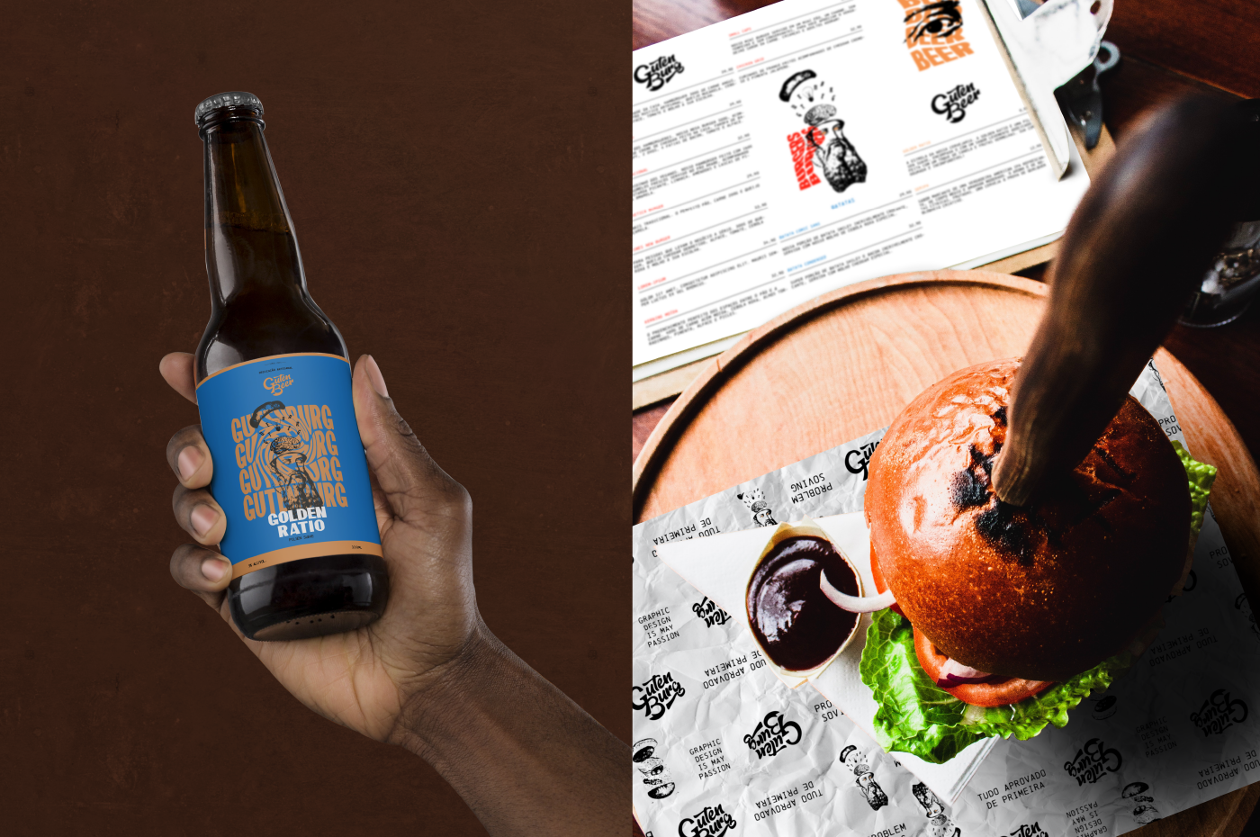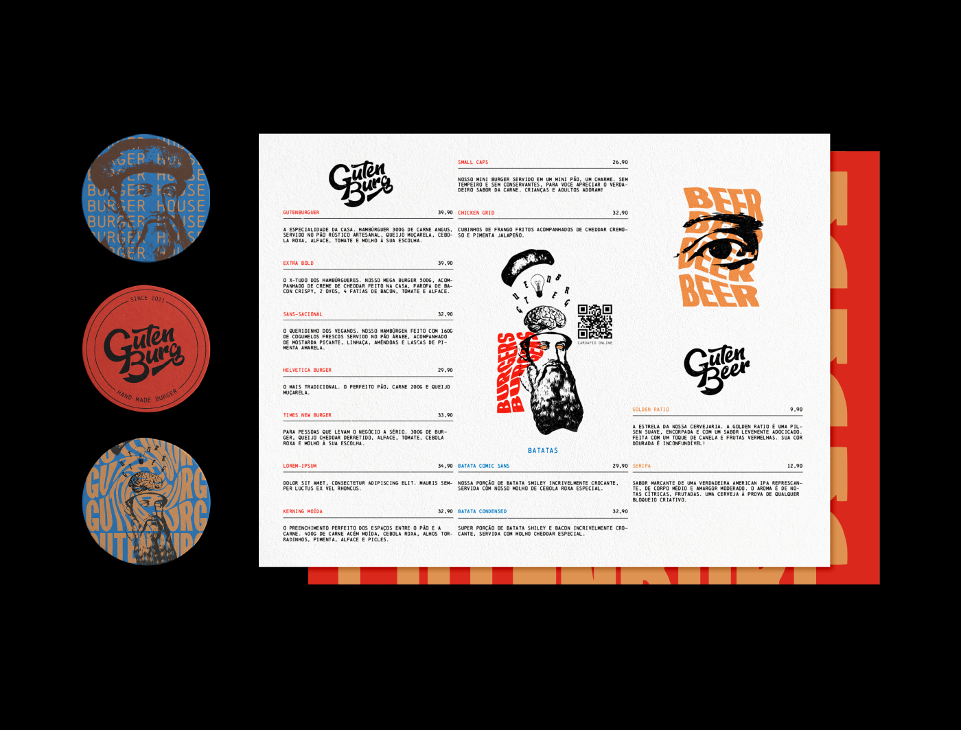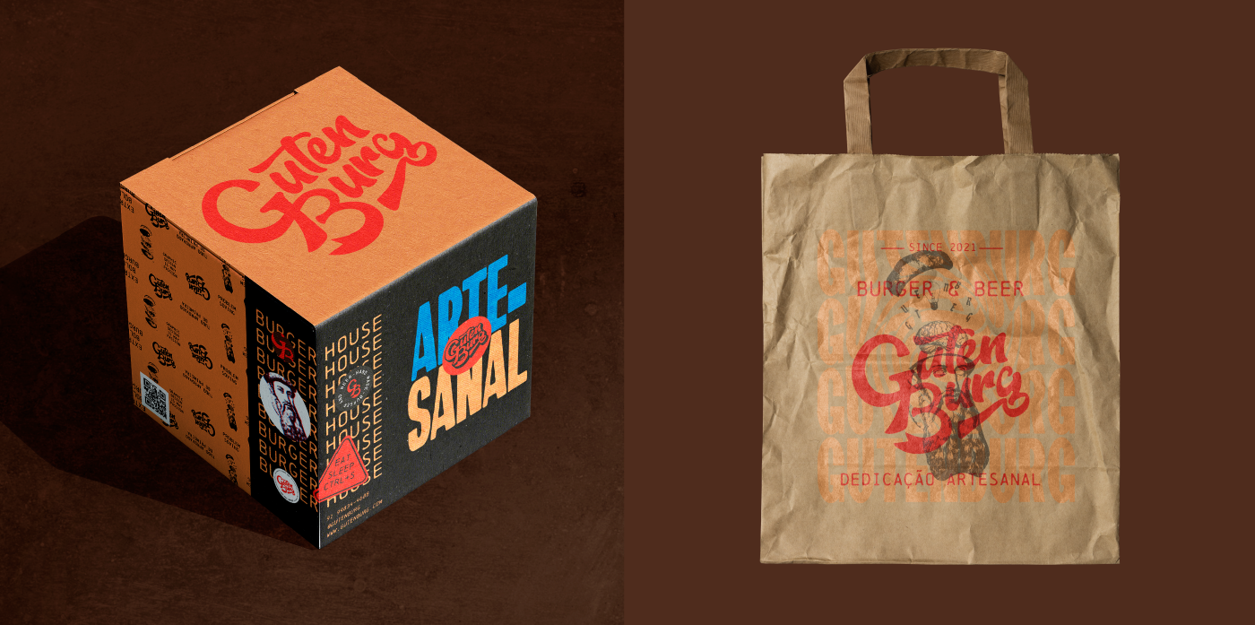 Gutenburg is a themed artisanal burger shop inspired by Johannes Gutenberg, inventor of the printing press and known as the father of the press. Its mission is to provide a unique experience through design and good cuisine, with themed and copyrighted recipes. In addition to handcrafted foods, natural ingredients, sauces and beers made in-house, the burger shop stands out through a welcoming and creative environment, seeking to reach professionals and students of Design, Advertising, Photography and people passionate about art and other creative disciplines, without ignoring the public that is not connected to the creative market.